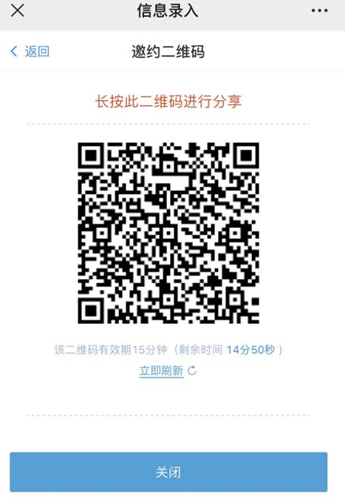点击“邀约二维码”,将生成一个专属于申请人的二维码,发给来访者,由来访者及时完成后续填报(请注意信息安全)。