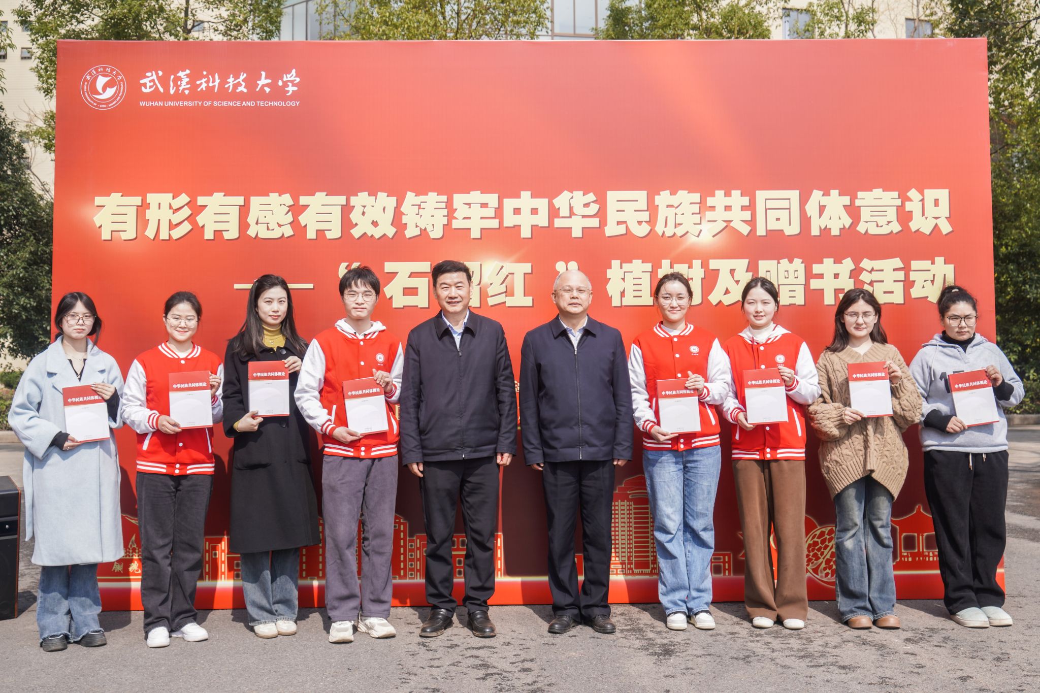 活动结束后,徐雁冰、倪红卫为植树学生赠送书籍《中华民族共同体概论》。