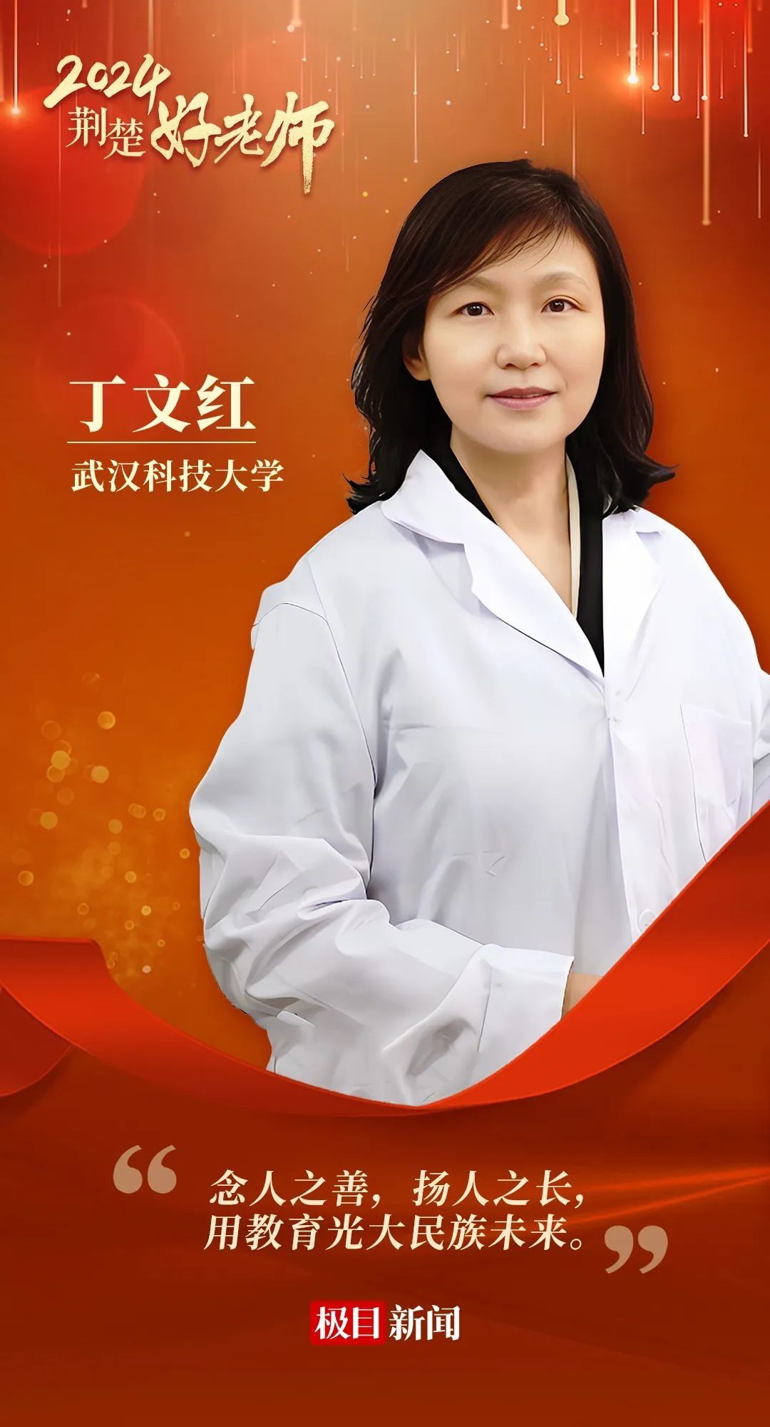 今年8月,在中共湖北省委教育工作委员会、湖北省教育厅、中共湖北省委宣传部、湖北省总工会的指导下,楚天都市报·极目新闻联合湖北省教育基金会,启动2024年“荆楚好老师”宣传选树工作。主办方共收到近300份由各地教育部门及高校推荐的事迹材料。经个人申报、组织推荐、资格审查、专家推选、征求相关部门意见以及公示后,49名(组)“荆楚好老师”名单正式公布。他们是全省68.7万名专任教师中,牢记为党育人、为国育才的初心使命的师德标兵,也是躬耕教坛、立德树人,为奋力谱写教育强国荆楚篇章作出贡献的时代先锋。