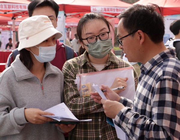 “同学你好,你们是什么专业的呀?”“物流管理。”“那很适合我们公司呀,快来坐下看看。”招聘会现场企业为学生积极介绍公司情况,学生在仔细了解公司待遇、薪资情况、职业发展前景等问题后再结合自身情况选择是否投递简历。