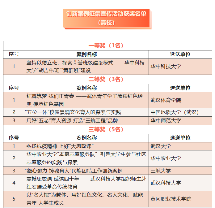 据悉,“喜迎二十大 筑梦新时代”湖北省文明校园青少年思想道德建设工作创新案例征集宣传活动从2022年8月份开始启动,共征集到全省文明校园报送案例323篇,最终评选出高校组创新案例一等奖1篇,二等奖3篇,三等奖5篇,优秀奖15篇。