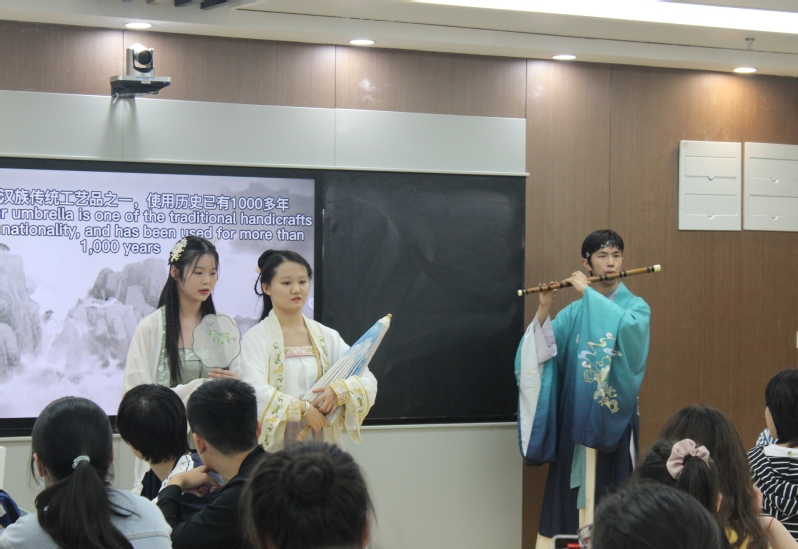 为了让学生们感受到活起来的汉字,魏敏邀请了汉文化社的学生们表演了汉服秀。“中国有服章之美谓之美,有礼仪这大故称夏,始称华夏。”身着汉服的同学们随着解说之声一一登场,有的拿着油纸伞,有的吹箫,还有的拿着团扇,整个课堂俨然一副泱泱华夏的盛景。