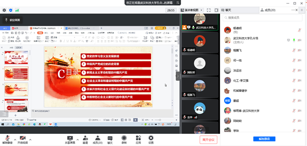 孔令浩从“党史的学习意义及发展脉络”“中国共产党成立的历史背景”“新民主主义革命时期的中国共产党”“社会主义革命和建设时期的中国共产党”“改革开放和社会主义现代化建设新时期的中国共产党”“中国特色社会主义新时代的中国共产党”六个方面对如何讲好《中国共产党的光辉历程》这一节党课进行了系统梳理,制作了全新课件和参考材料。一是更加准确地展示了党史发展的重要阶段,每个阶段增加了“党面临的主要任务”和“取得的伟大成就”。二是增加了有关湖北省、武汉市以及同学校建设发展有关的历史人物、事件和案例,更加贴近学生。三是增加了最近的重要会议及成果。四是增加了拓展学习的内容。