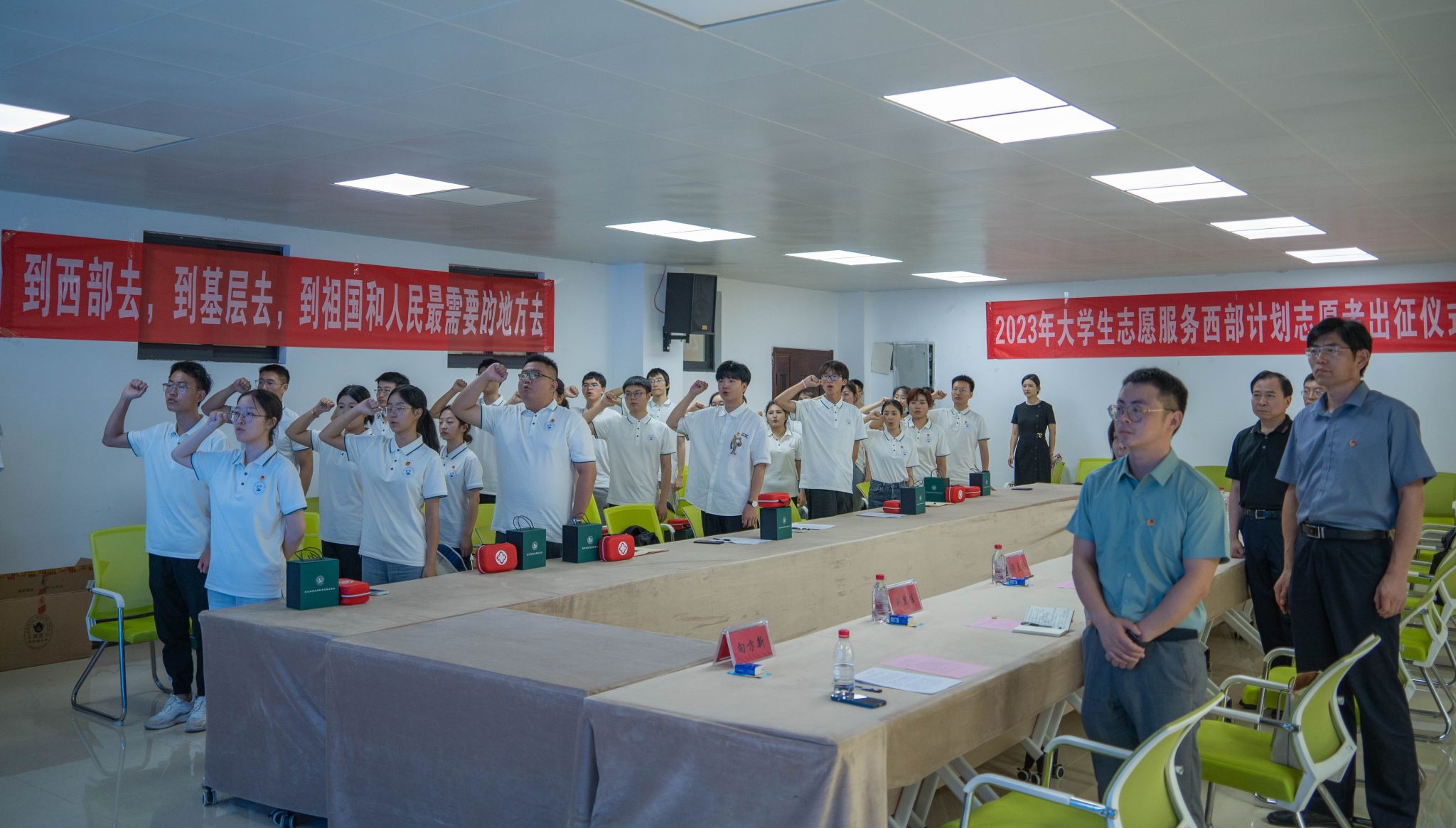 西部计划志愿者们全体起立,举起右拳,进行出征仪式宣誓,他们表示将坚定走向祖国最需要的地方,在奉献和实践中实现自我价值,书写精彩人生。