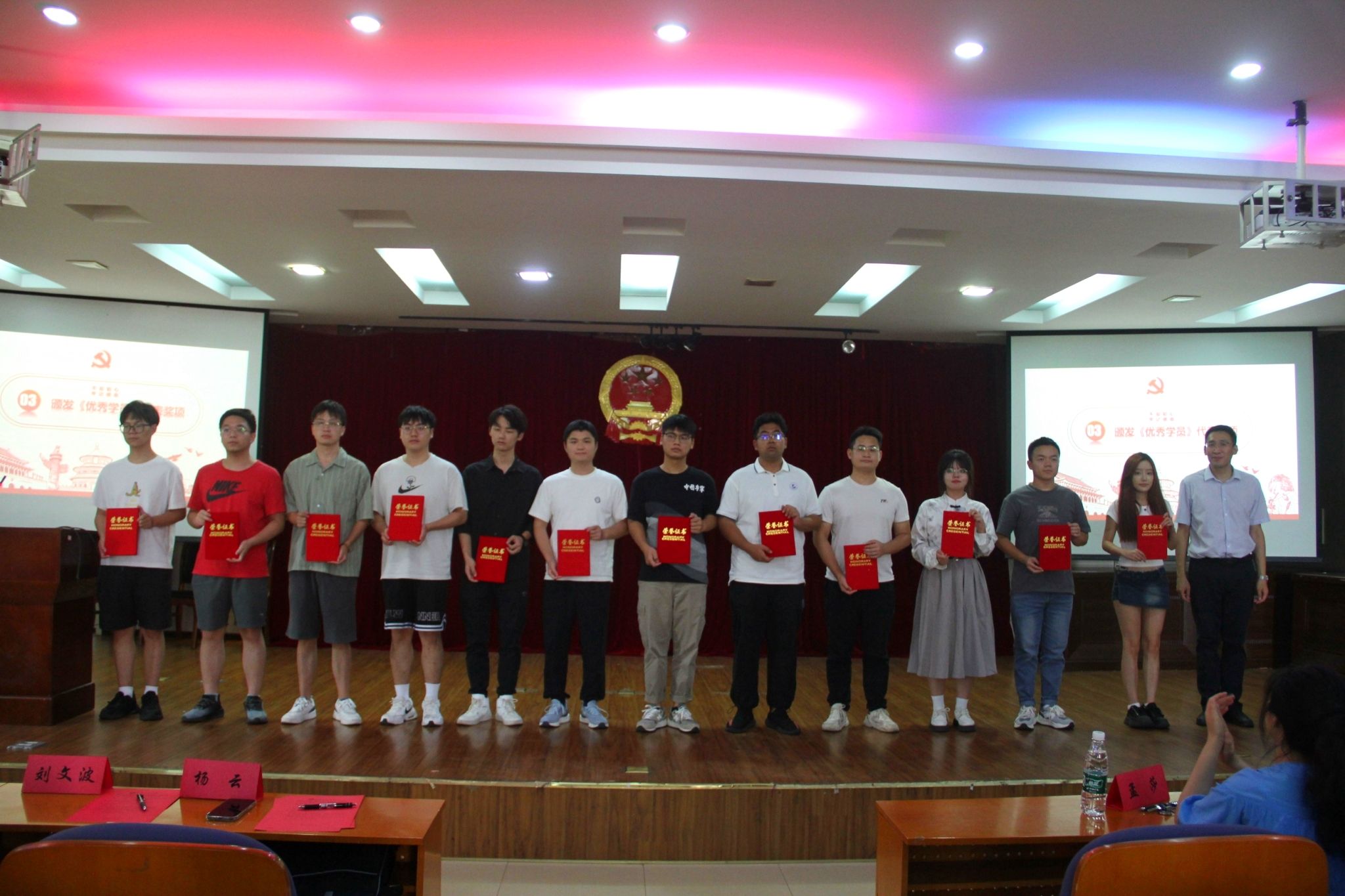 会议第二阶段暨第六期研究生骨干班结业典礼在齐唱国歌声中拉开序幕,由研工部汪筱渊宣读“优秀学员名单”,研工部副部长杨云颁发第六期研究生骨干培训班优秀学员奖项。