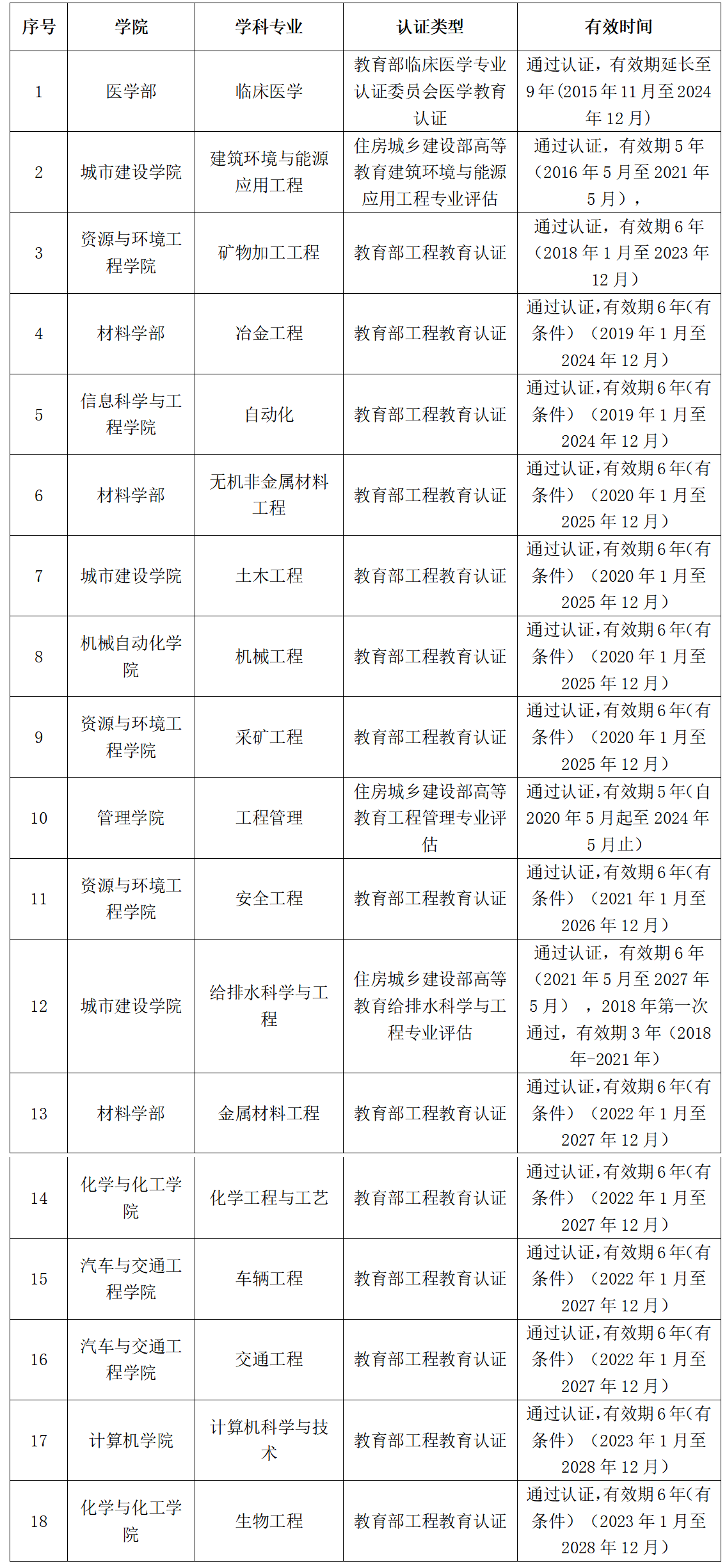 武科大网讯(通讯员曾琦)近日,中国工程教育专业认证协会正式发布了2022年工程教育专业认证结论和中期审核结论。我校计算机科学与技术、生物工程专业完成了申请审核、自评审核、专家组现场考查、结论审议等程序,通过了工程教育认证,有效期6年。同时,我校机械工程、无机非金属材料工程、土木工程、采矿工程四个专业通过了中期审核,有效期保持至2025年12月。