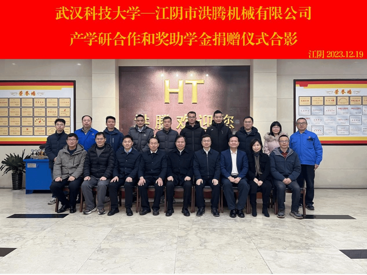 武科大网讯(通讯员张坡)12月19日上午,机械自动化学院与江阴市洪腾机械有限公司共同举办的产学研合作和奖助学金捐赠仪式在洪腾机械有限公司会议室举行。校党委副书记孙国胜、公司所在地党委行政负责同志、洪腾机械有限公司董事长薛洪权、机械自动化学院党委书记余淑均、校友工作与社会合作处副处长刘昱佳、机械自动化学院党委副书记瞿孝平以及信息科学与工程学院、机械自动化学院教师代表参加了此次仪式。仪式由薛洪权主持。