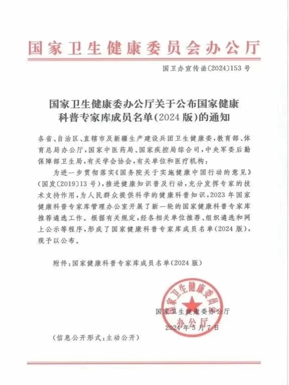 据悉,本次全国共有1844人入选国家健康科普专家库,涉及健康促进与教育、营养与食品安全、心理健康与精神卫生、公共卫生、全科医学等42个领域,湖北省共有71位专家入选。(附属老年病医院)