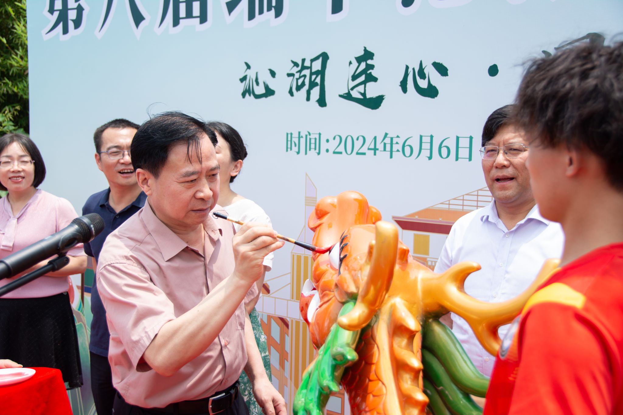 武科大网讯(见习记者刘靖瑶 通讯员朱博文 摄影孙奕哲 母鑫宇 李周阳)“端午舟飞争竞渡,沁水龙腾念九歌。”6月6日下午,我校第八届“沁湖连心·同舟共济”端午沁湖龙舟友谊赛暨端午文化展演于黄家湖校区沁湖举行,师生们齐聚沁湖边,传承端午习俗,感受中国传统文化。校党委副书记孙国胜,党委常委、副校长沈季伟出席此次活动。活动由校团委书记王媛媛主持。