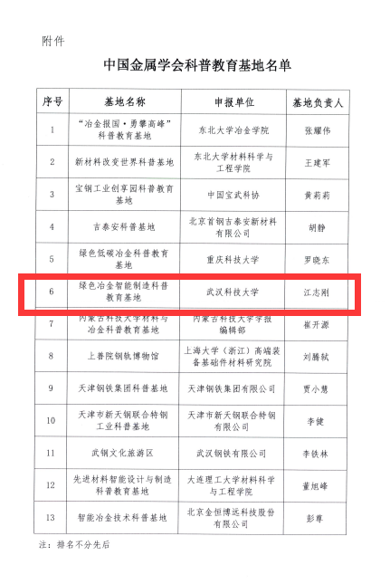 武科大网讯 近日,中国金属学会发布了《关于认定中国金属学会科普教育基地的通知》,认定13家单位(机构)为中国金属学会科普教育基地,我校工程实践创新中心申报的 “绿色冶金智能制造科普基地”成功入选。