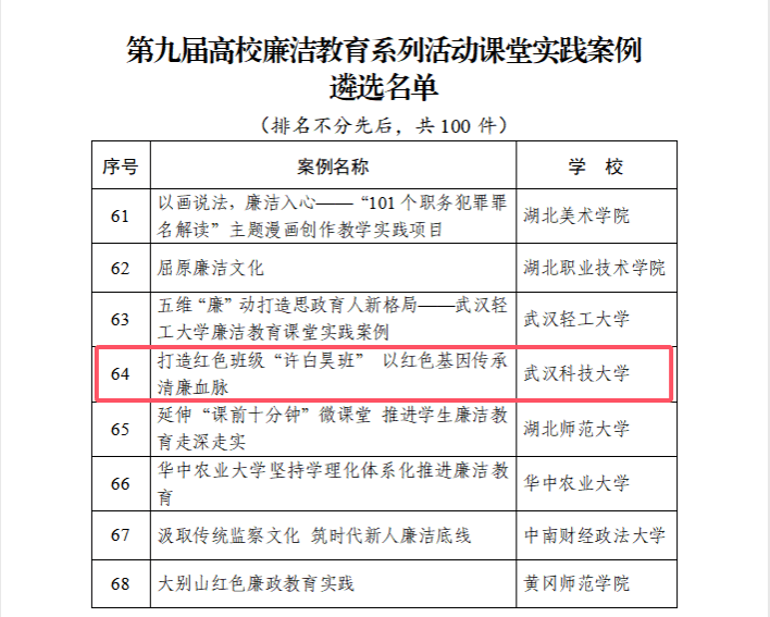 武科大网讯 近日,教育部公布了第九届高校廉洁教育系列活动评选结果。由我校法学与经济学院杜逸涵等报送的作品《打造红色班级“许白昊班” 以红色基因传承清廉血脉》入选课堂实践案例遴选名单。