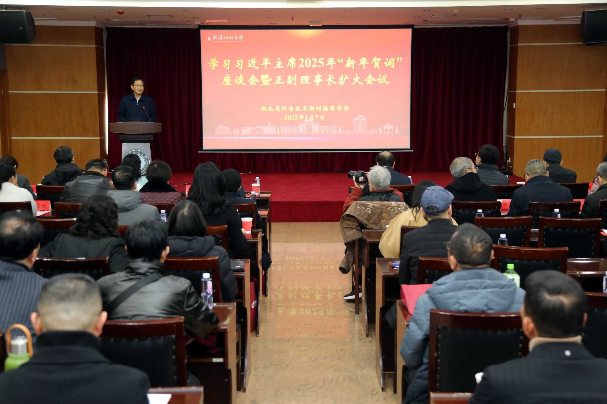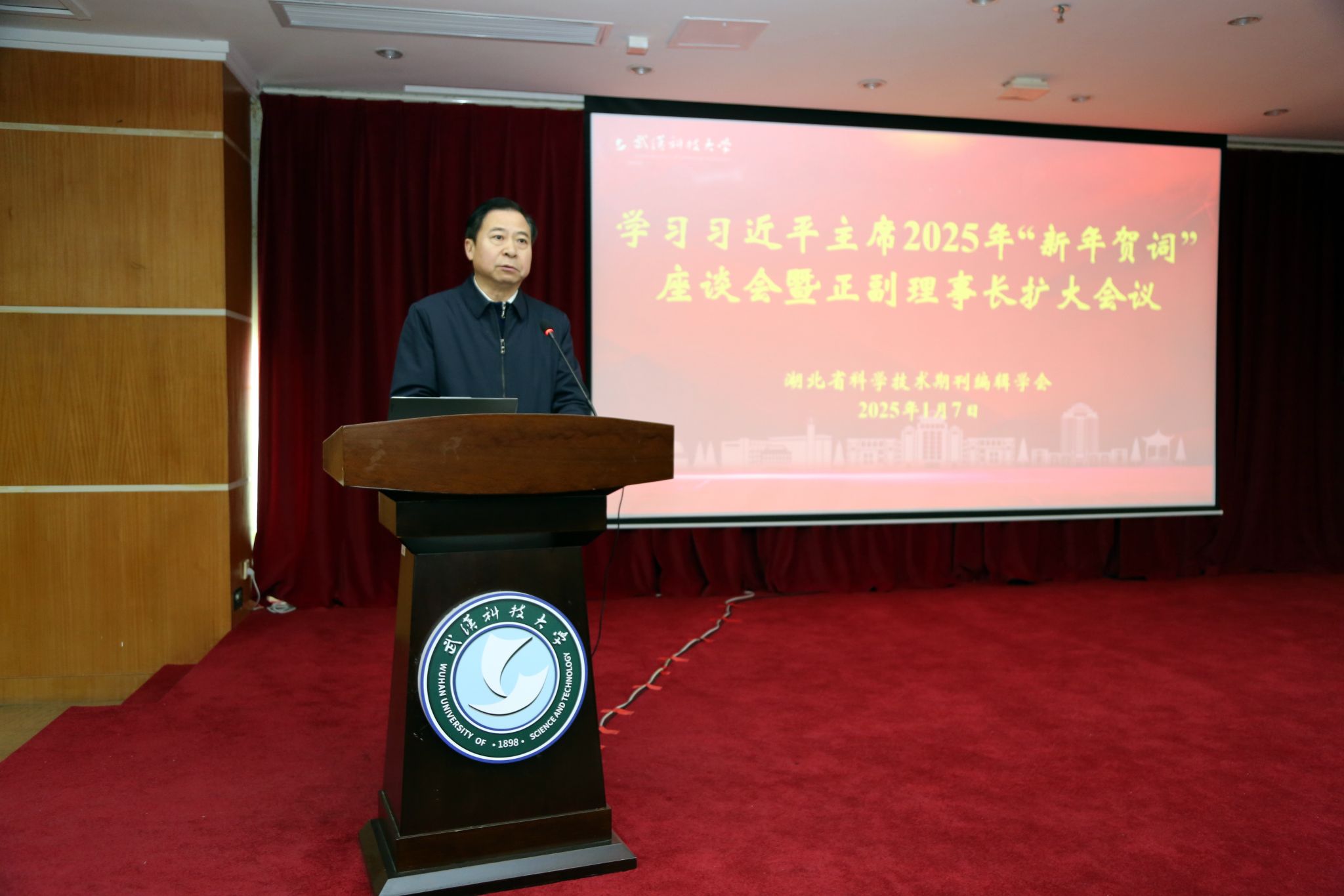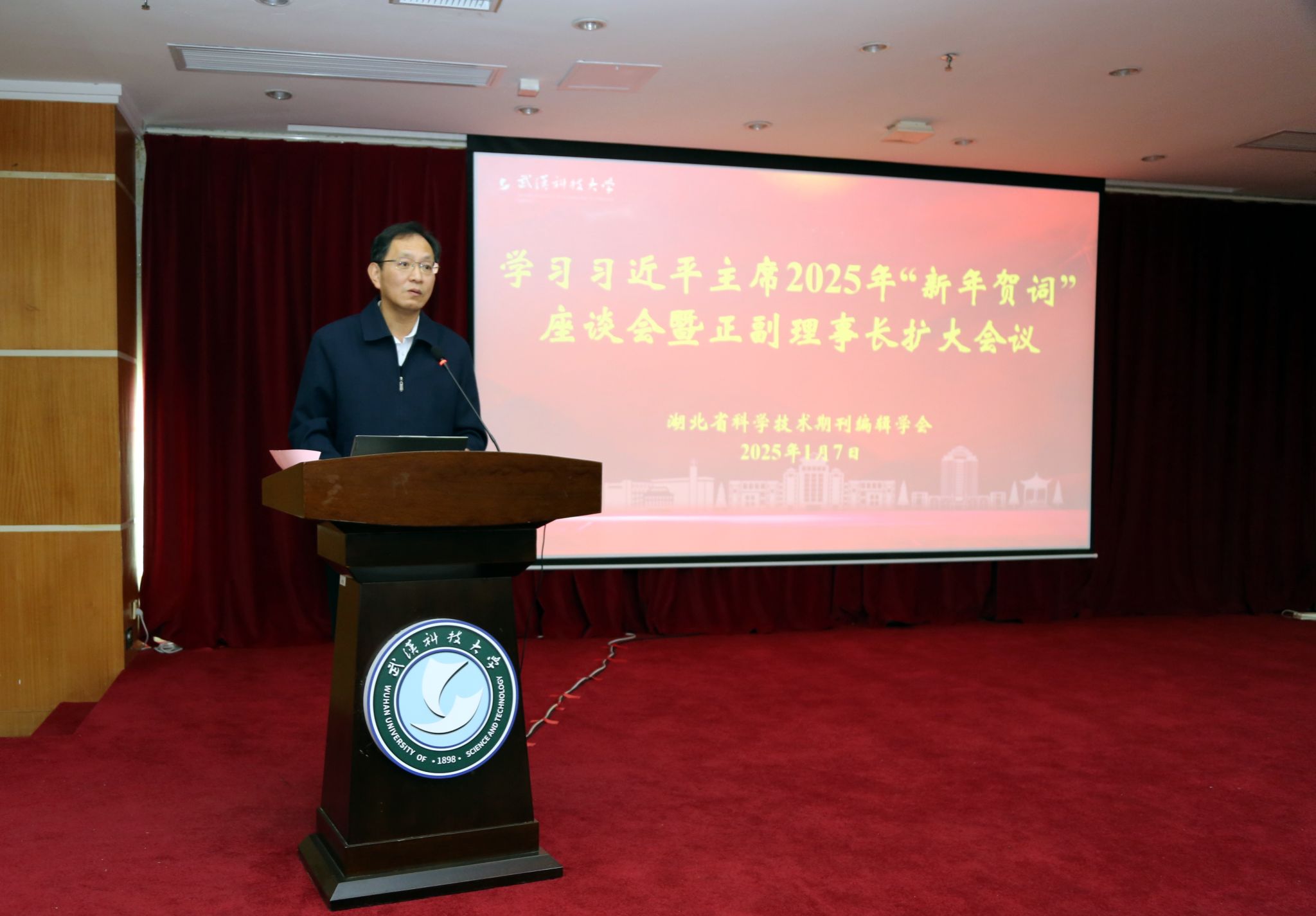 武科大网讯 1月7日,学习习近平主席 2025 年 “新年贺词” 座谈会暨湖北省科技期刊编辑学会正副理事长扩大会议于我校青山校区主楼18楼报告厅举行。校党委副书记孙国胜出席会议并致辞。会议由湖北省科技期刊编辑学会理事长赵经主持,近百位相关领域专家学者齐聚一堂。