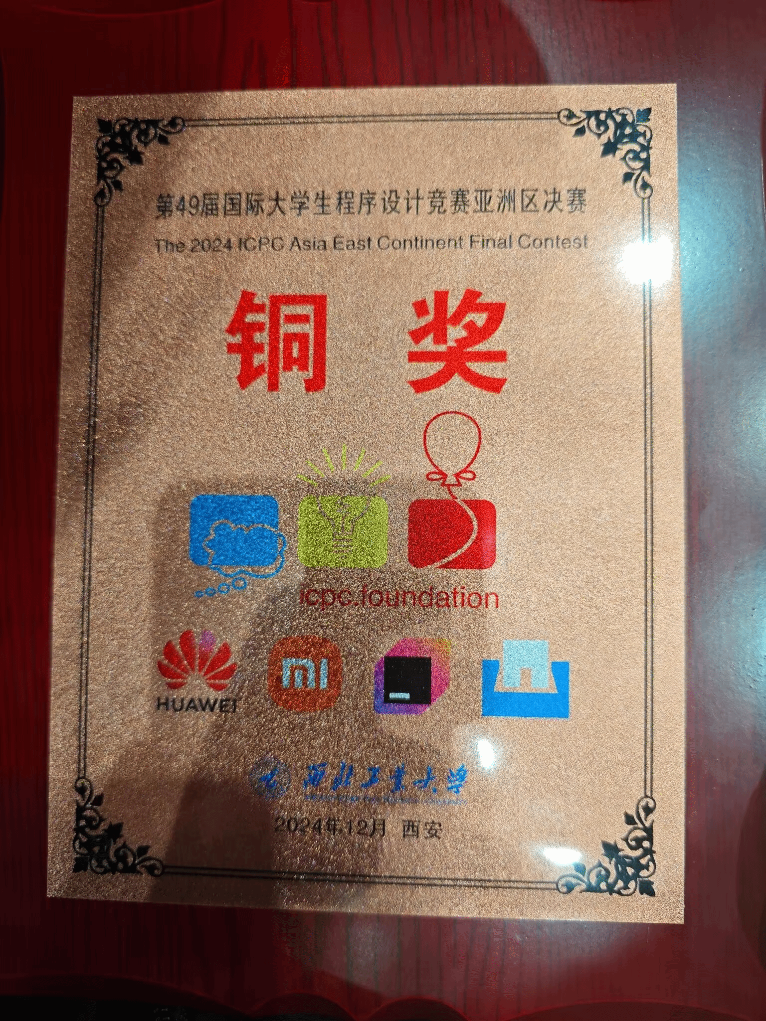 武科大网讯(通讯员管沙隆 张炎)12月28日,2024年国际大学生程序设计竞赛亚洲区决赛(ICPC EC-Final)在中国圆满落幕。我校计算机科学与技术学院ACM俱乐部成员计算机科学与技术2205班孙煜恒、2205班万家梁、2206班朱俊杰组成的“RELX悦刻幻影PRO”队,与来自亚洲各赛区的顶尖高校队伍同台竞技,最终凭借出色的表现斩获铜牌。
