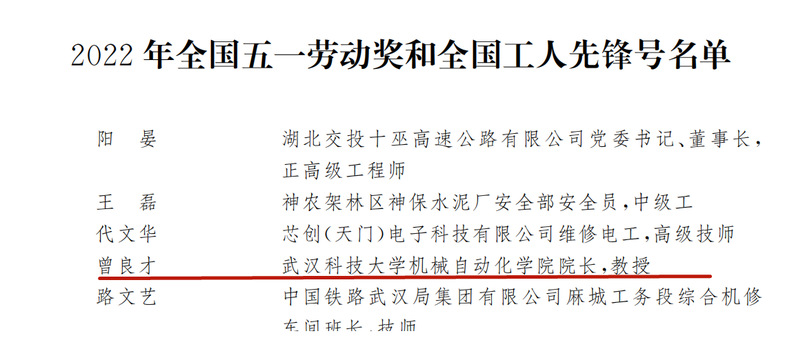 机械自动化学院曾良才教授获2022年全国五一劳动奖章