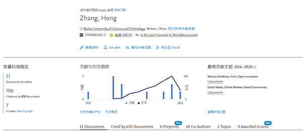 据Scopus数据显示,张洪教授在2011-2022年累计发文11篇,被670篇文献引用了706次。引用次数在2021年达到引用峰值184次。
