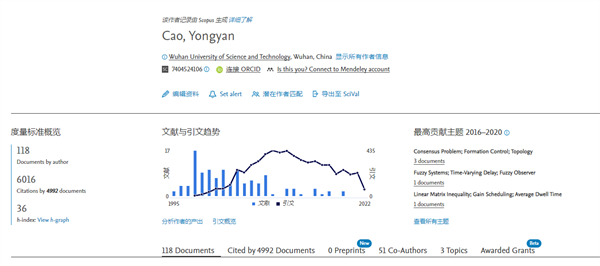 据Scopus数据显示,曹永岩教授在1995-2022年累计发文118篇,被4992篇文献引用了6016次。引用次数在2009年达到引用峰值435次。