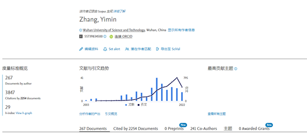 据Scopus数据显示,张一敏教授在2003-2022年累计发文267篇,被2254篇文献引用了3847次。引用次数在2021年达到引用峰值795次。