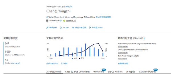 据Scopus数据显示,程用志教授在2010-2022年累计发文167篇,被2718篇文献引用了5010次。引用次数在2021年达到引用峰值1082次。