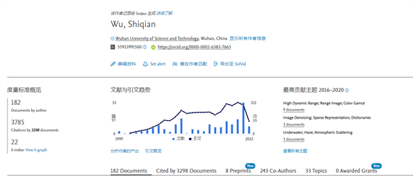 据Scopus数据显示,伍世虔教授在1999-2022年累计发文182篇,被3298篇文献引用了3785次。引用次数在2020年达到引用峰值321次。
