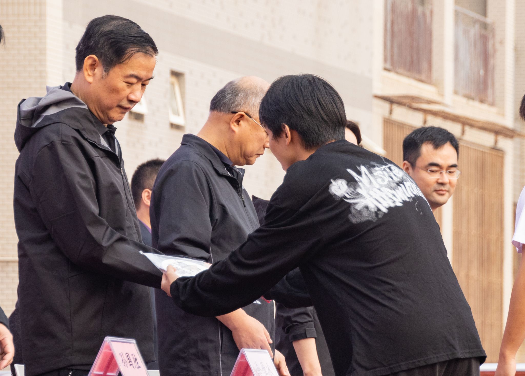 校长倪红卫赠与学生代表足球 杨曜恺摄