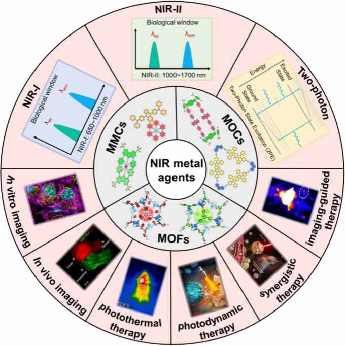 近几十年来,金属药物在临床前研究和临床应用方面取得了令人瞩目的成就,但其递送、治疗效果、可视化示踪和疗效评价等方面仍然受短波长的限制。近红外(NIR, 650-1700 nm)成像技术的迅速发展为这些问题提供了解决方案。具有近红外吸收/发射的金属试剂有助于提高治疗效果,可视化示踪和及时监测治疗效果。因此,全面概述近红外金属试剂的构建策略、光物理特性和生物医学应用 (图1),将有助于未来开发出性能更好的近红外金属试剂,用于实现更为精准的医疗。