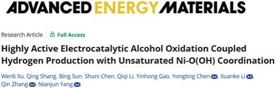 武科大网讯(通讯员李江江)近日,我校化学与化工学院张琴、李轩科、陈永婷团队在《Advanced Energy Materials》期刊发表题为“Highly Active Electrocatalytic Alcohol Oxidation Coupled Hydrogen Production with Unsaturated Ni-O(OH) Coordination”的研究论文(DOI:10.1002/aenm.202504916)。该研究提出了一种由碳层限域的不饱和Ni–O(OH)稳定化Ni晶体组成的Ni–O(OH)–C电催化剂,可在安培级电流密度下实现乙醇电氧化制乙酸(EOR)、析氢反应(HER)及其集成系统的卓越性能。陈永婷、李轩科、张琴、比利时哈瑟尔特大学杨年俊为论文共同通讯作者。