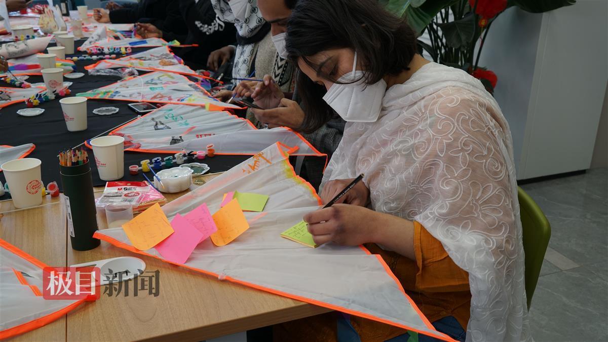 在放风筝的活动上,留学生自由发挥,在白风筝上面画上自己喜爱的图案,并且贴上写好心愿的纸条,在室外尽情放飞风筝。“我的风筝飞起来了!我的心愿也放飞了!”留学生米卡欢呼起来。