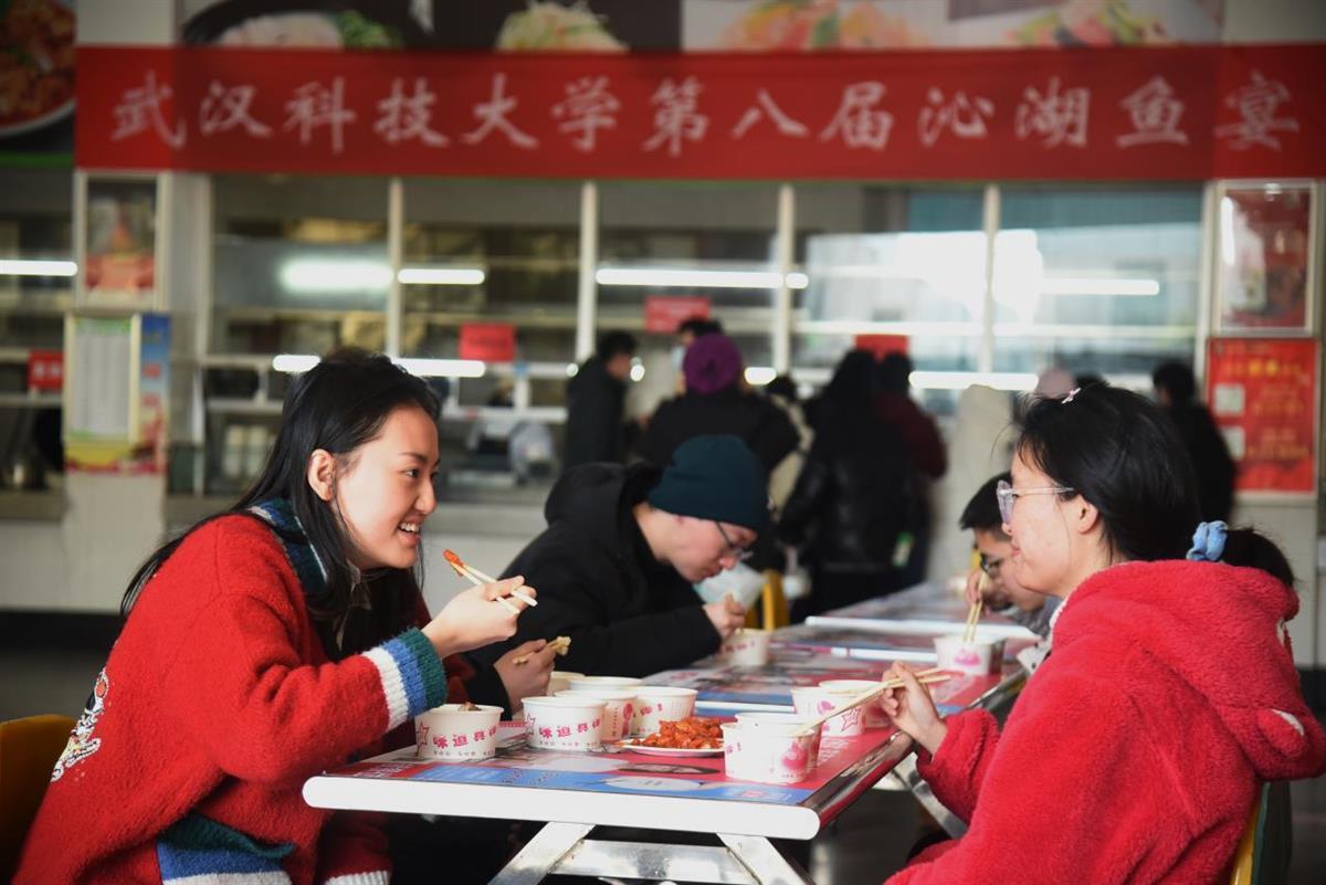从12月5日开始,武科大转为线上教学,大部分学生已经离校返乡,但学校冬至吃鱼的传统依然延续。该校食堂精心烹饪了红烧鱼块、糍粑鱼块、剁椒鱼头、鱼头豆腐汤、饺子等美味,全校师生凭校园卡领取免费鱼肴一份。