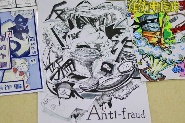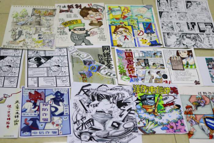 马克笔绘制的“国家反诈中心APP”彩色漫画、针管笔绘制的“八个凡是”黑白漫画、用平板绘画绘制的诈骗连环漫画……新生们以多种风格的漫画来宣传反诈骗知识。