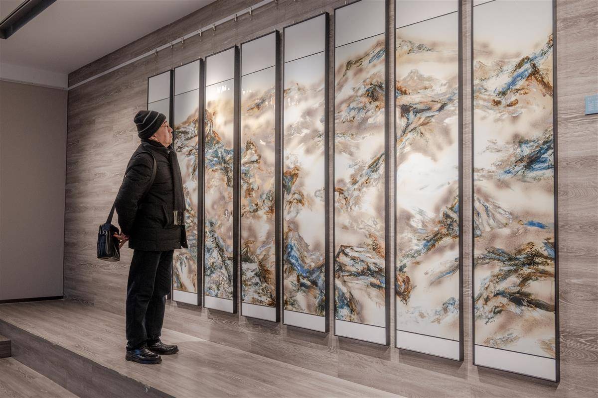 作品《江山》吸引众多师生驻足,整幅作品由八个独立板块拼接而成,主绘山川绵延之态,黑白灰的主色调之间穿插着流光溢彩的釉色。此次展览也有不少学生作品。绘画专业研究生康志昊对西北戈壁有“亲切感”,他以戈壁上的古长城残迹和夯土为主题,在导师徐武斌的指导下创作的作品《雄风依旧》。
