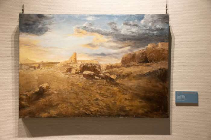 本次展览首次加入了学生作品。该校2022级绘画专业研究生康志昊来自山西,对西北的戈壁有着“亲切感”,他在导师徐武斌的指导下,绘制出了戈壁上掠过的一段古长城残迹和夯土堆成的土堆,以此展现长城的雄伟,最终将作品命名为《雄风依旧》。徐武斌表示,让学生参与展览,促进他们同专业画家的交流、学习,对更好地培养下一代优秀油画艺术家和传承优秀文化有重要意义,这也将作为今后研究会的重要议题。参展作家从不同维度创作,作品《古村落》《郭家沟》《喀什小镇》《太行山》等聚焦中国本土景观,《夏日》《金秋十月》《雪》等作品展现四季风光,《太极剑研究》通过抽象艺术展现中华优秀传统文化。