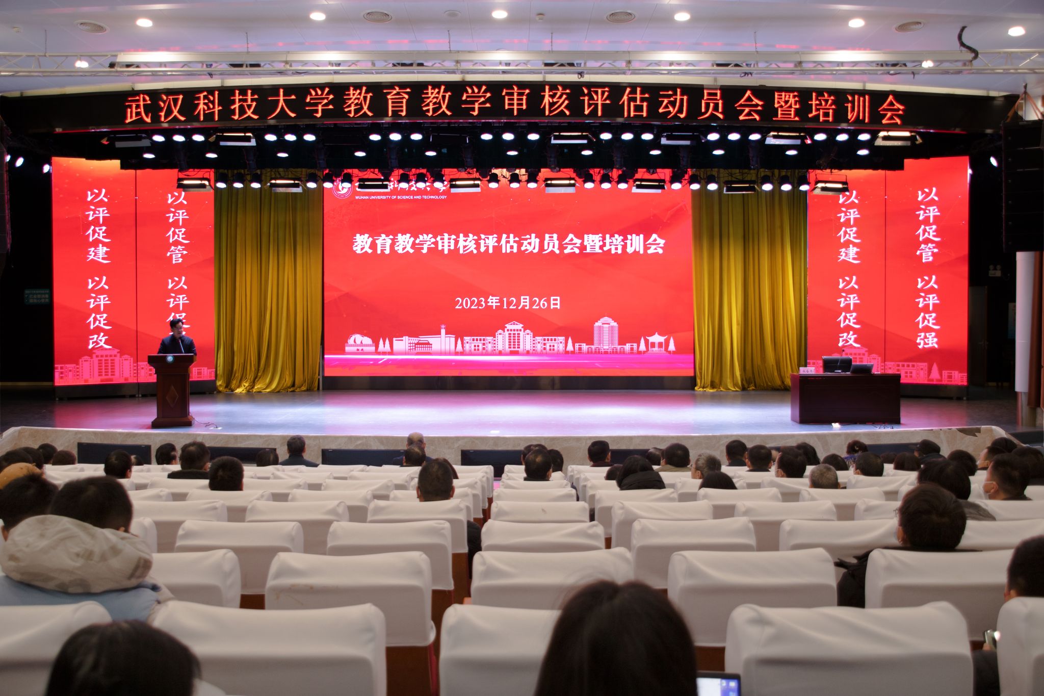 倪红卫部署审核评估重点工作。他指出,新一轮审核评估是落实党和国家深化新时代教育评价改革的重要举措,是加快构建中国特色高等教育质量保障体系的重要途径,是学校高质量发展面临的历史机遇和重要考验。全校师生进一步统一思想、凝聚共识,强化主人翁意识,以高度的责任心和使命感投入到本次审核评估工作中,为全面提升本科教学质量,率先实现湖北省属高校“双一流”建设突破,把学校建设成为特色鲜明的一流大学而努力奋斗。