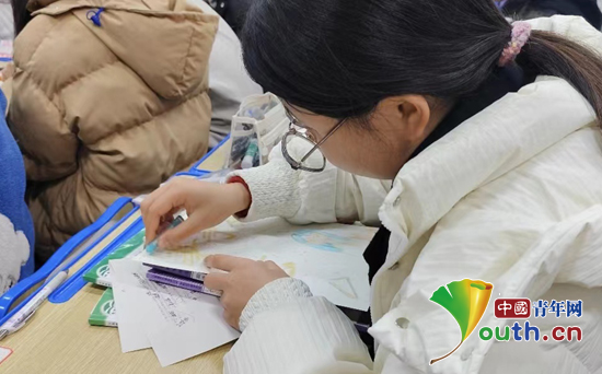学生认真制作贺卡。武科大研支团供图