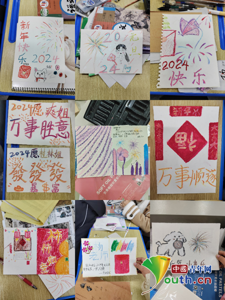 活动中,研支团成员事先采购好油画棒和卡纸,带领学生制作贺卡,并逐一作出指导。学生们纷纷发挥巧思妙想,围绕新年主题开展设计,烟花、对联、中国结……一个个新年元素跃然纸上。