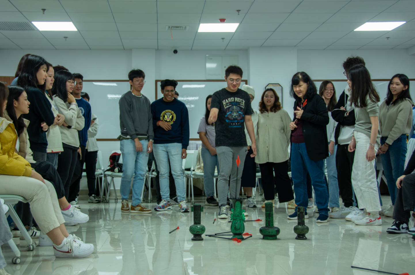 潇湘雨协会成员讲解了投壶与捶丸,师生们纷纷尝试,举行了男子组与女子组的比赛。新加坡义安理工学院学生陈建宇是男子组投壶次数最多的学生,他说:“我每次投之前都会许愿学业有成,投中了就会非常开心!”新加坡义安理工学院教师李浩仪表示:“我认为投壶更新奇、更益智一些,更测试眼力和手法,而捶丸像高尔夫,能运动到的肢体更多。”