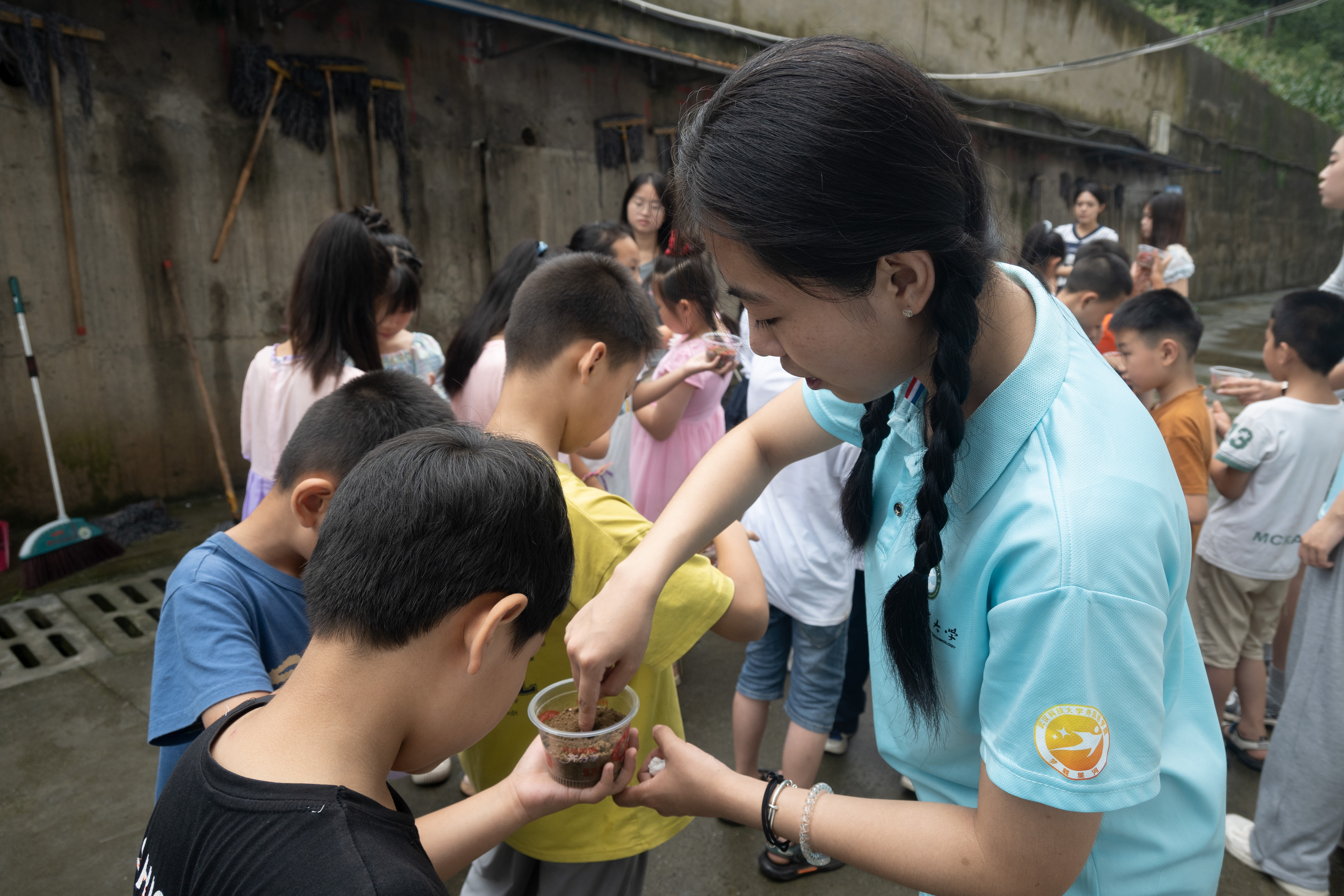 “在劳动中学习,学生们才真正能体会到粮食的来之不易。”“梦载星河”实践队队员刘亦翚从舌尖上的浪费、如何文明用餐、如何节约粮食三个部分展开讲解,并与其他队员们一起带领学生们播种。队员们为学生们分发盛有土壤的容器和水果黄瓜种子,一边介绍播种的知识和技巧,一边带领他们种下黄瓜。