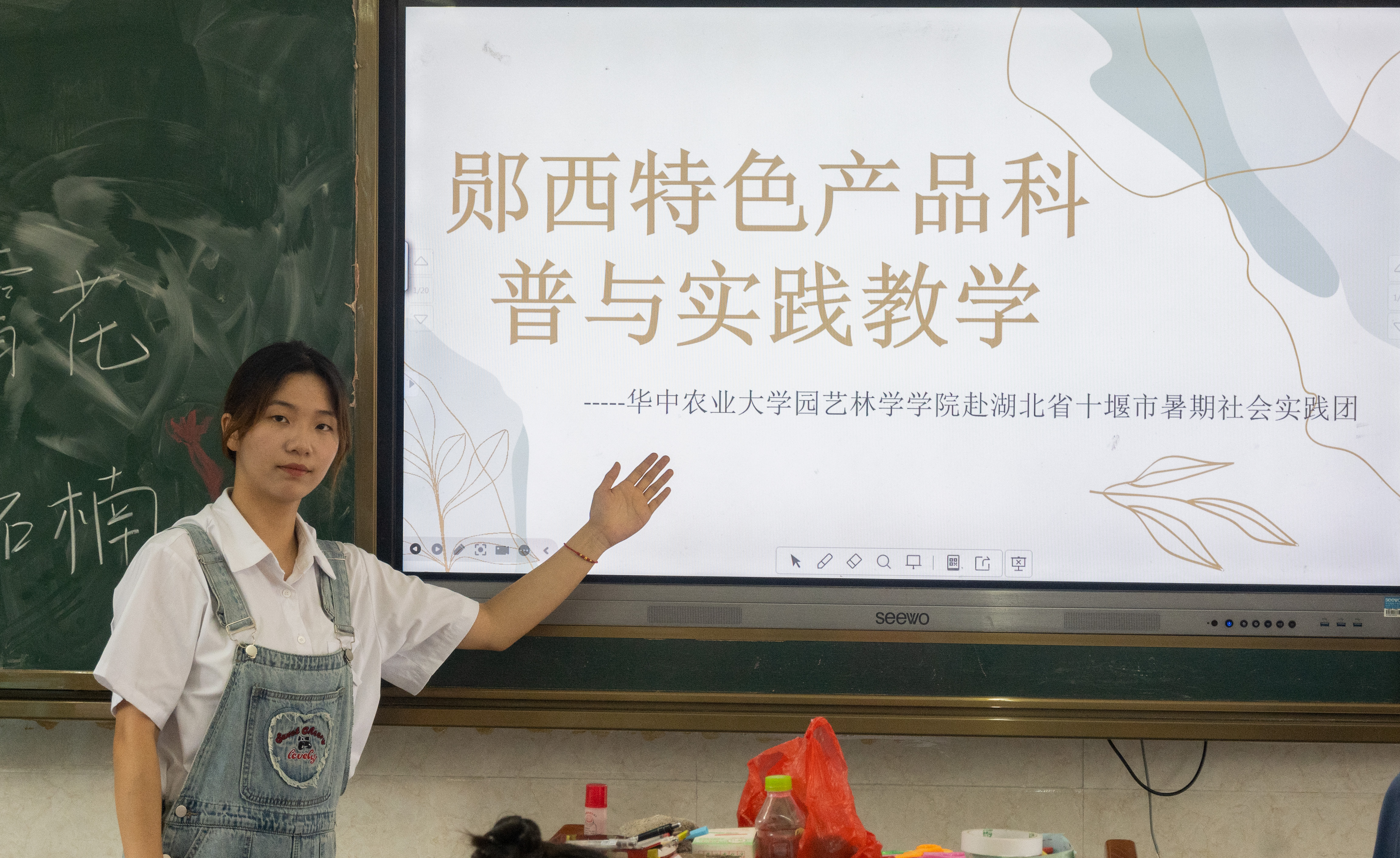 华中农业大学实践队队员田佳星带来了团队实验大棚里的茄子、圣女果等,对比讲解实验大棚里的植物与当地特色农作物在外形、效用、生长情况等方面不同之处,为小朋友普及家乡农作物的知识。“老师,我们这里的茄子有圆的!”“这个辣椒我家里也有种!”学生们纷纷兴奋地交流。