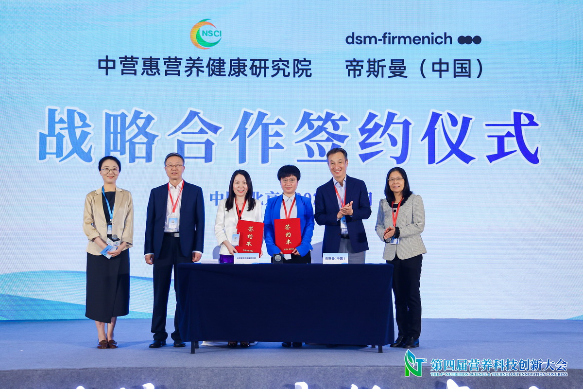为更好地将营养健康科技转化为产业新生命力、赋能人类营养新使命,中营惠营养健康研究院与帝斯曼(中国)在大会开幕环节举行了战略合作签约。中国营养学会副秘书长、中营惠营养健康研究院执行院长王瑛瑶,帝斯曼-芬美意TTH事业部大中华区副总裁江玮女士分别代表双方签署了战略合作协议。中国营养学会常务副理事长马爱国教授、帝斯曼-芬美意中国区总裁周涛、帝斯曼-芬美意中国区总裁顾问诸琳瑛共同见证了这一重要时刻。双方将发挥各自优势,聚焦“营养健康相关原料、配方的创新性研发和产业化解决方案”,共同努力突破营养健康研究和应用领域的更多瓶颈,用好技术、好配方、好产品服务人民群众健康。