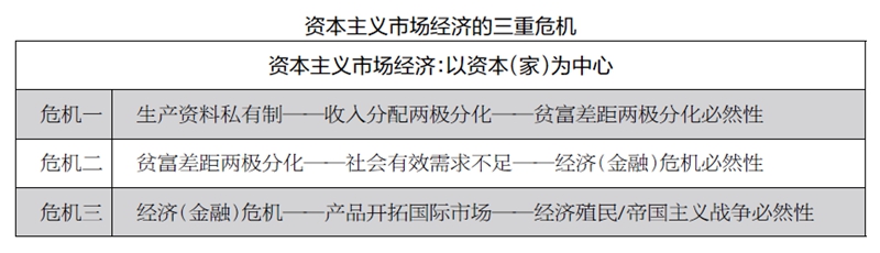(二)资本主义市场经济的三重危机。现实中的资本主义市场经济,在以资本(家)为中心的原则之下,存在三重危机:第一,以生产资料私有制为基础,生产决定分配,财富越来越集中于少数资本家手中,最终必然导致贫富差距两极分化。第二,贫富差距两极分化,一方面机器大生产供给了海量的商品;另一方面,占社会消费主体的工人阶级处于贫困边缘,购买力不足,于是生产只能经常性中断,必然导致周期性的经济(金融)危机。第三,资本主义社会内部,产品严重相对过剩,不得不寻求外部市场,对广大发展中国家而言,就意味着经济殖民(和平手段)或者发动帝国主义战争(非和平手段)。理论分析中充分竞争的市场,现实中总是被少数几个头部企业所垄断;理论分析中单个企业生产的有序性,现实中整个社会生产的无序性;理论分析中价格手段就是那只“上帝之手”无所不能,现实中价格调整滞后性对实体经济与就业岗位的破坏肉眼可见;理论分析中经济危机常态性归咎于有效需求,归根到底是购买力不足而不是所谓的心理预期等,这一切均表明在表面繁荣的背后是私有制的资本主义市场经济。在个人理性的假设前提与私产保护的道德粉饰之下,掩盖了弱肉强食丛林法则的低水平动物本性。