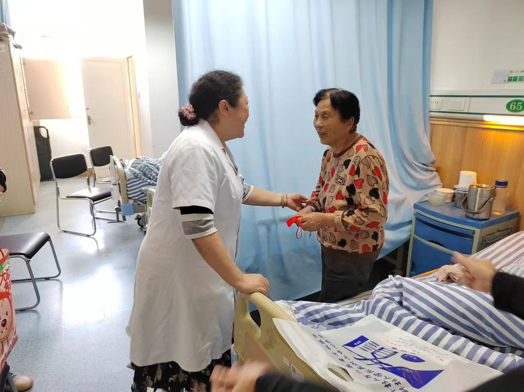 为让因疾病而无法与家人团聚的患者感受到节日的温暖和关怀,重阳节这天的午后,阳光透过窗户洒在病房里,呼吸内科的责任护士正在认真地为一位行动不便的老年患者修剪指甲;活动室里,几位医护人员正在布置医患座谈交流会的场地、瓜果、茶水 。