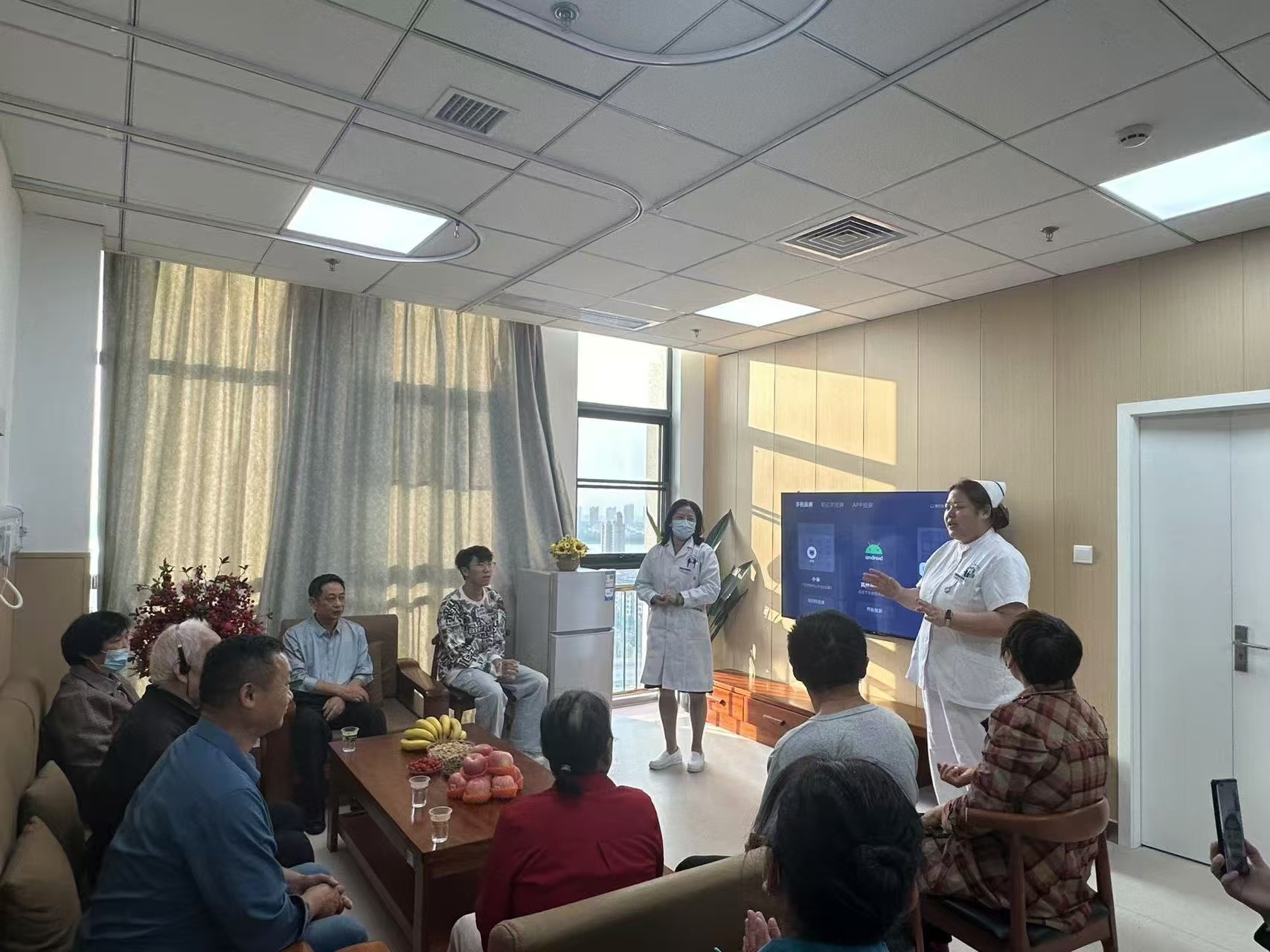 当天傍晚时分,重阳聚会正式开始,老年患者及家属们被邀请到活动室,大家围坐一堂,桌上摆放着热腾腾的菊花茶和香甜可口的水果,大家在品尝着美食的同时共话健康,医护人员认真倾听患者的需求与困惑,耐心解答,并提供心理支持,欢声笑语充满了整个房间。患者李爷爷感慨道:“感谢呼吸内科的医护人员,他们不仅医术精湛,还这么有爱心。她们搞的这个座谈交流会真是太好了,我很开心,感受到了家一般的温暖。希望这种活动能一直持续下去。”