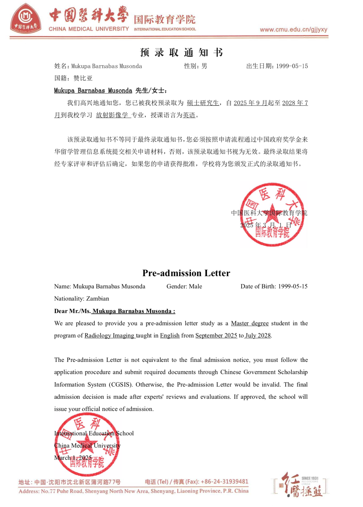 2024年7月,班南山带着武科大的推荐信,来到了由中国援建的赞比亚利维·姆瓦纳瓦萨医院,加入了第25批援赞中国医疗队(2024-2025年度)开展的临床实习项目。在这所现代化医院里,他不仅担任医疗队的“翻译官”和“协调员”,更以实际行动架起中赞医学交流的桥梁。今年春天,凭借突出的综合素质,班南山通过自主申请成功被中国医科大学放射影像学专业预录取,将成为首批系统学习这一新兴学科的赞比亚青年医者之一。
