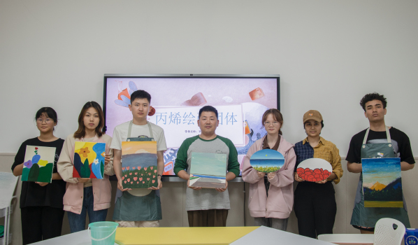 “丙烯绘画表达”活动中,罗思宇首先对活动主题——“绘画表达”进行了简单的介绍。接着他从绘画工具开始,温柔细致地向学生们讲解每一道作画步骤,并结合事先准备好的图片样稿,逐一向学生们分析其绘画要点和方法。