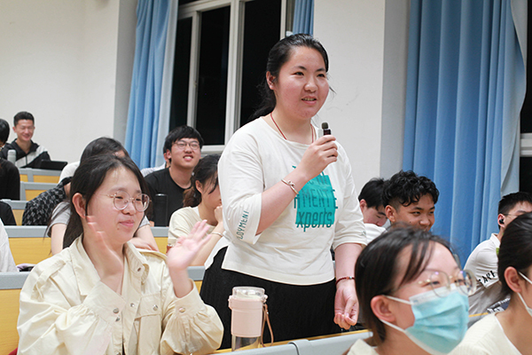 社工2201班陈晓煜以“佛提本无树,明镜亦非台 本来无一物,何处惹尘埃”来描述自己的体验感受,同时向教授提出了在日常生活中接触不到颂钵如何疏解心理压力的问题。“让我们变成颂钵,改变我们的口型发出不同的音节,通过不同的音频疏通身体不同的脉络。”教授幽默地回答道。