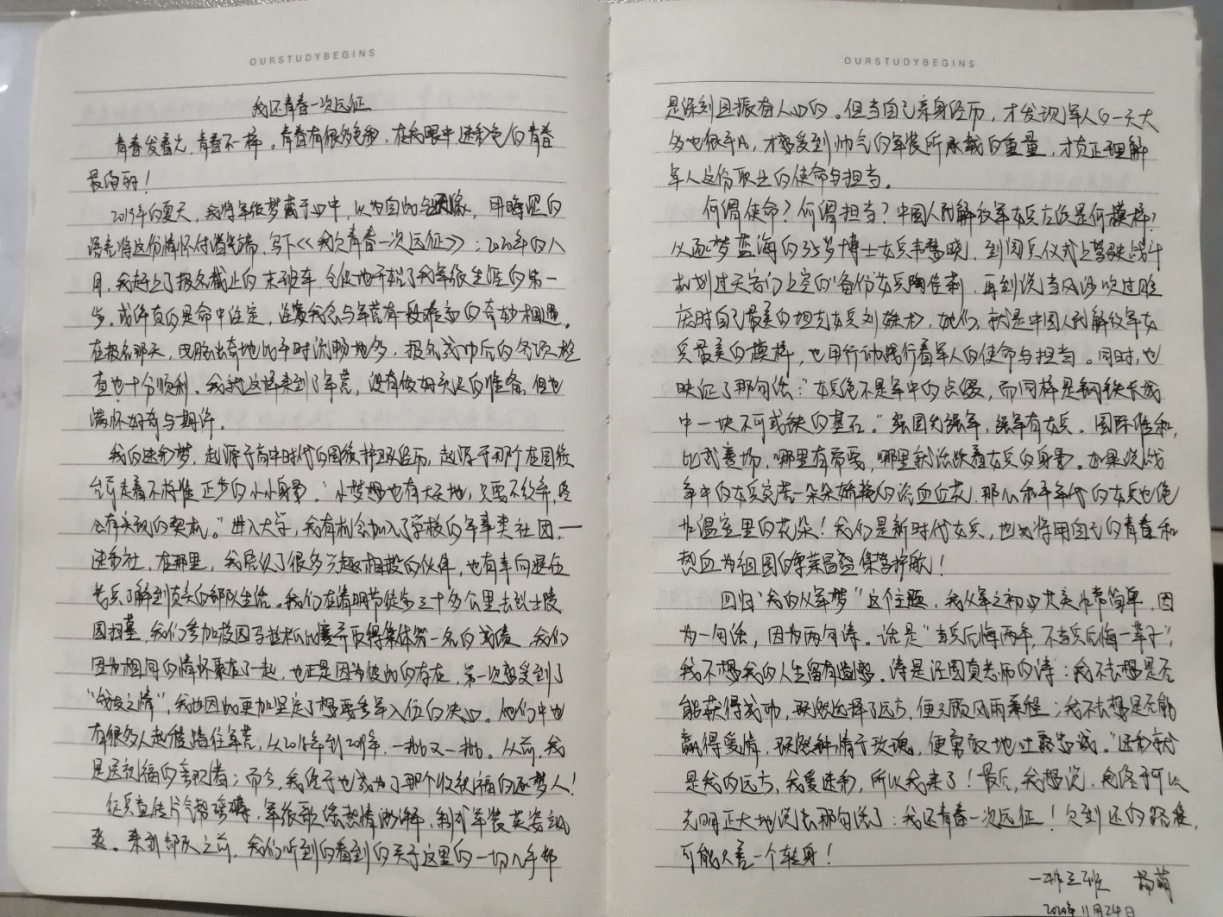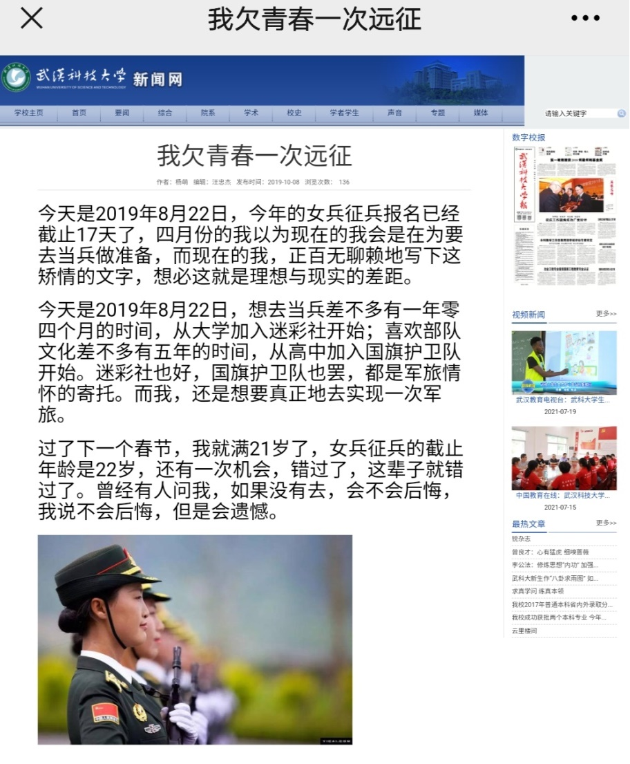 今天是2019822日,今年的女兵征兵报名已经截止17天了,四月份的我以为如今的我应该在为去当兵做准备,而现况是我正百无聊赖地写下这矫情的文字,想必这就是理想与现实的差距。”2019年的夏天,我将军旅梦藏于心中,以为自此与之无缘,用晦涩的语言将这份情怀付诸笔端,写下《我“欠”青春一次远征》。