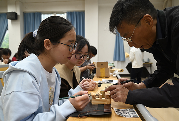 本就喜爱书法的学生周昕怡兴致勃勃,主动上前体验篆刻流程。刘忠示范过后,周昕怡用篆书字体在纸上写下了“中文”二字,再用刻刀一刀一划地将汉字雕刻在砂纸打磨加工后的印石上。为完美呈现效果,刘忠继续对印章进行一一修改、打磨。“如果你刮掉了字体的部分,那么印章印出来的就是镂空的字样;如果你刮掉了空白部分,那么印章印出来的就是字体本身。”刘忠鼓励着学生尝试新玩法。
