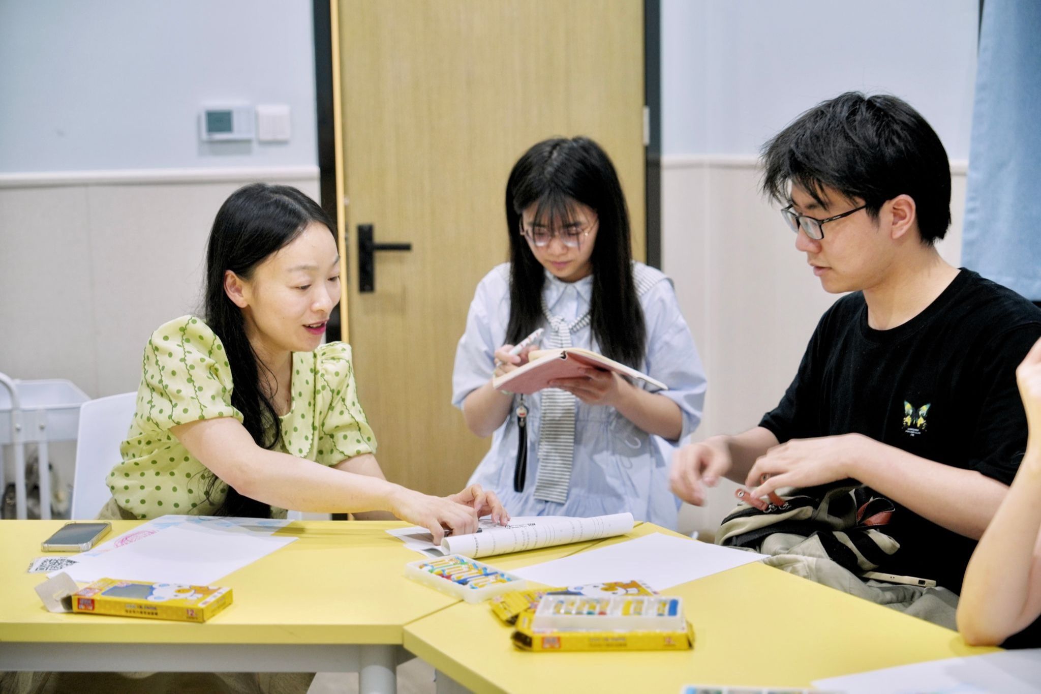 “我看见我的搭档用绿色的笔画了一条类似山脉的曲线,我就在下面用蓝色画了一片海。”一人一笔画环节,学生们每两人一组来进行创作,一人一笔轮流绘画。创作过程中,学生只能用绘画的方式来沟通。 “这个环节可以帮助学生们体会人际沟通的多样性,帮助同学们提高面对人际关系冲突时的心理阈值,让大家更能容易进入沟通场景,渐渐拥有良好的人际关系。”陈佳解释说。