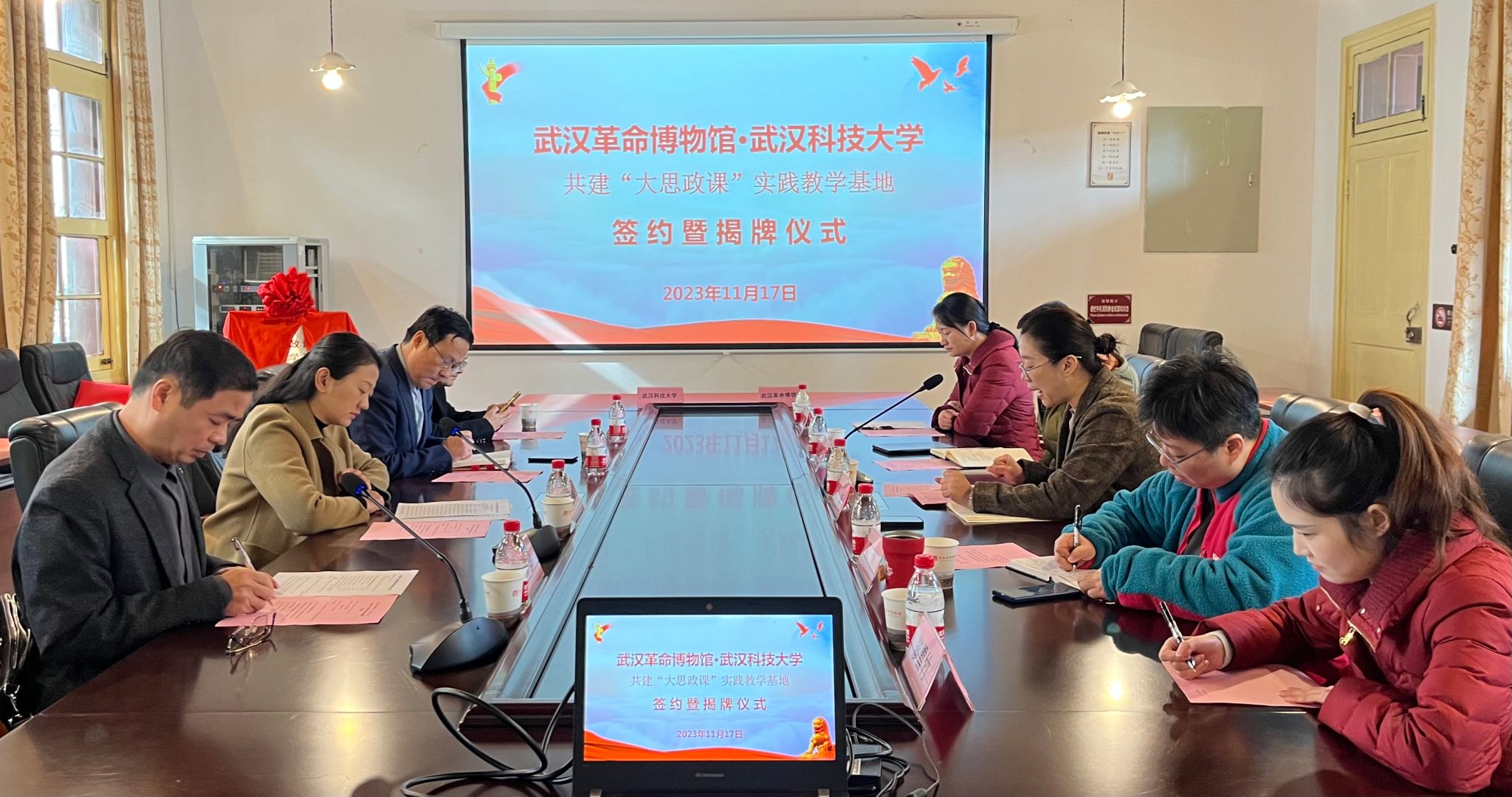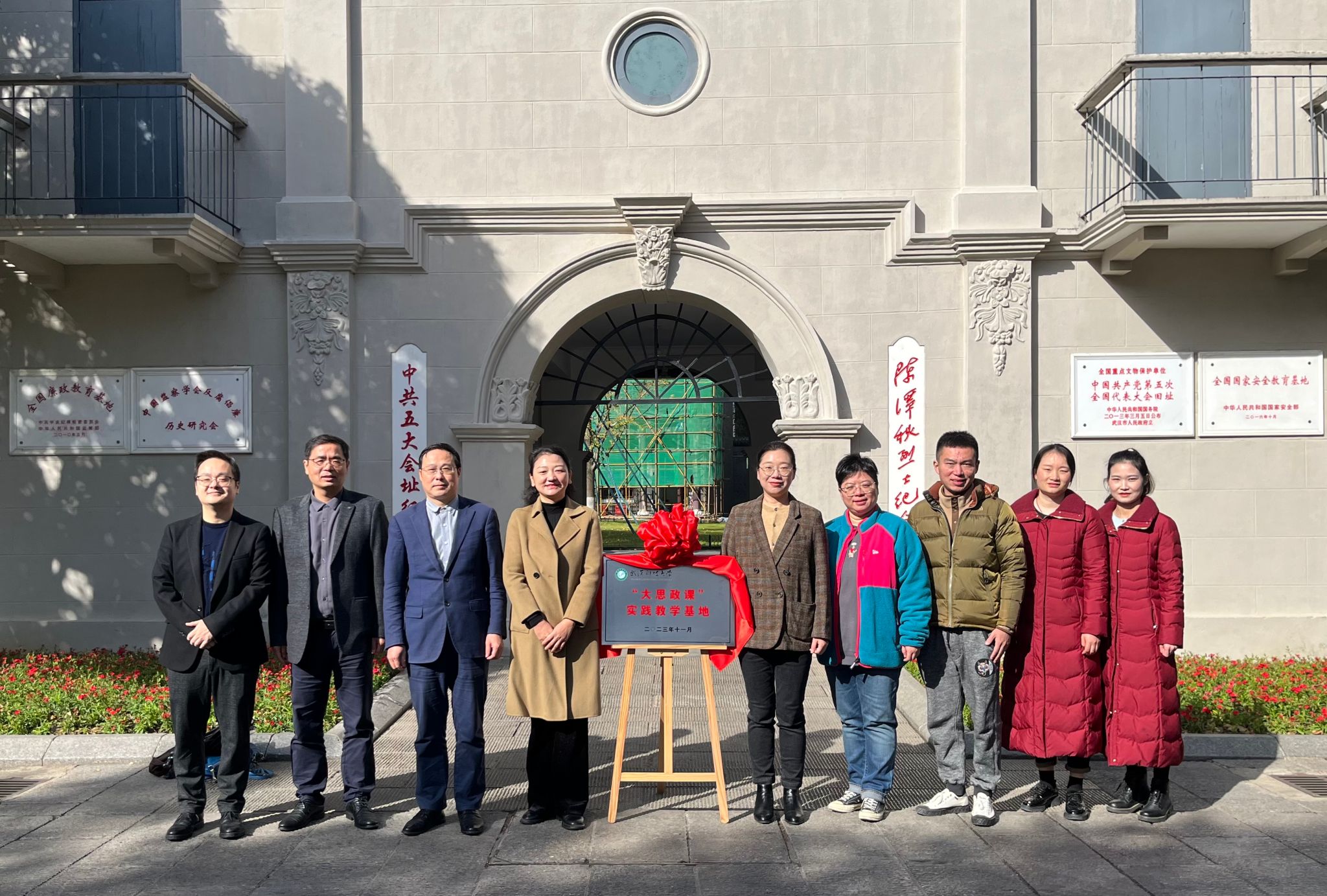 随后,刘文波代表学校与武汉革命博物馆签署共建协议,与会领导共同为我校“大思政课”实践教学基地揭牌并合影留念。
