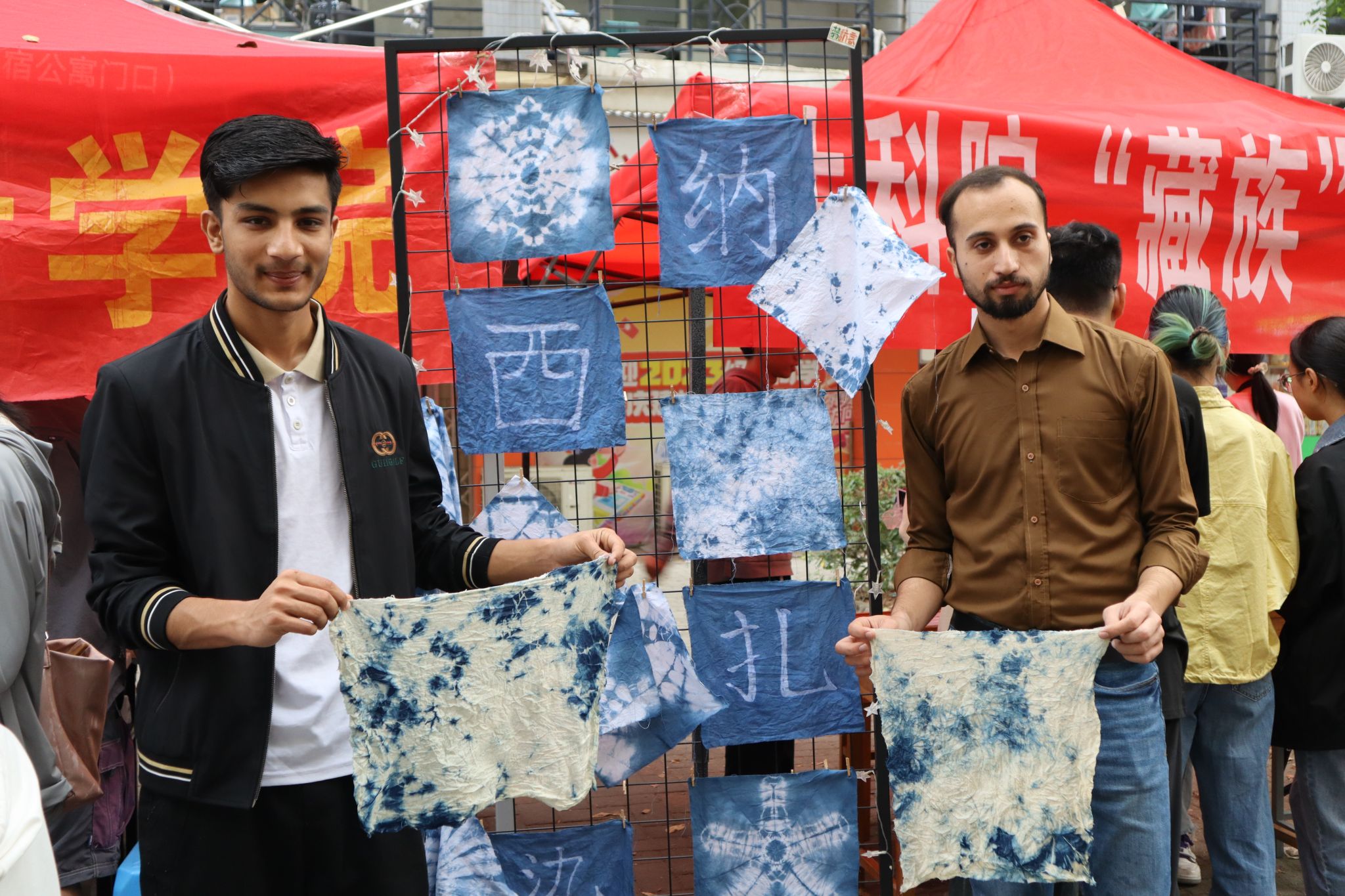 “扎染,又称绞缬。是一种古老的采用扎结染色的工艺,一般以蓝白色调为主,用来营造古朴的意蕴。”我校艺术与设计学院的负责人张乐妍在民族文化节的现场为大家介绍纳西扎染的制作手法。留学生沙宇轩Shah Saud和他的朋友共同体验了纳西族传统——扎染。他们确定了想要完成的扎染样式后,在工作人员的帮助下,完成了浸泡、捆绑、染色、冲洗一系列的步骤,得到了独属于他们的扎染作品。在欣赏自己的作品时,沙宇轩感叹道:“扎染真是一个有趣的工艺,我们都拥有了独一无二的扎染手帕。”