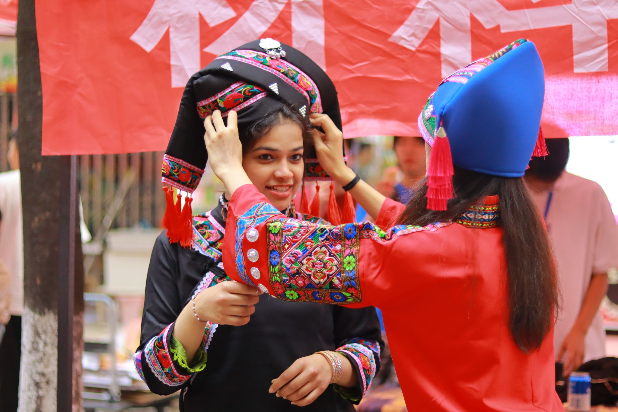 “中国少数民族的服饰也太精致了,每一针每一线都好漂亮。”在各文化展示帐篷内,人们可以欣赏到来自苗族、壮族、土家族、纳西族、维吾尔族、哈萨克族等十多个民族的服饰。留学生米娅和她的朋友们在路过瑶族的文化帐篷时,对瑶族的传统服饰产生了兴趣。瑶族文化帐篷的负责人帮助米娅换上了瑶族服饰,并向她介绍了瑶族特有的服饰特点。